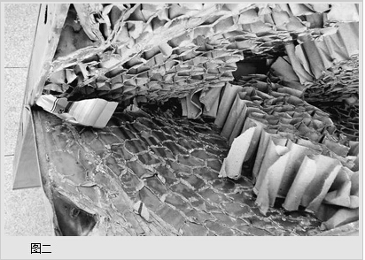 修好的防盗门,从外表看不出与其他防盗门有什么差别(图一),但两层铁皮里夹的全是纸壳(图二)。