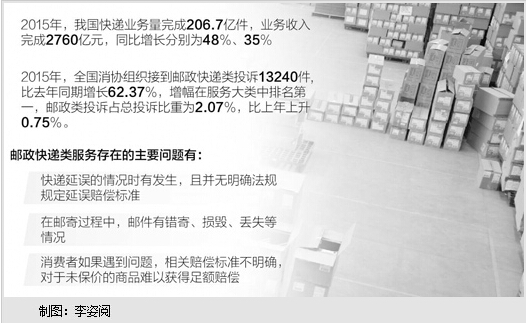 根据国家邮政局的统计,2015年我国快递服务业务量总计206.7亿件,年增48%;据粗略测算,全年快递业消耗了塑料编织袋29.6亿个、塑胶袋82.6亿个、包装箱99亿个、胶带169.5亿米、避免撞击的缓冲物29.7亿个。如此海量的快递包装垃圾,如果处理不当,不仅浪费资源,还会污染生态环境。