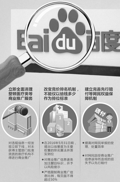 调查组在整改要求中明确表示,从即日起对医疗、药品、保健品等相关商业推广活动,进行全面清理整顿,对违规信息一经发现立即下线,对未获得主管部门批准资质的医疗机构不得进行商业推广。与此同时,还要求改变竞价排名机制,提出以信誉度为主要权重的排名算法并落实到位;对商业推广信息逐条加注醒目标识,并予以风险提示;严格限制商业推广信息比例,每页面不得超过30%。