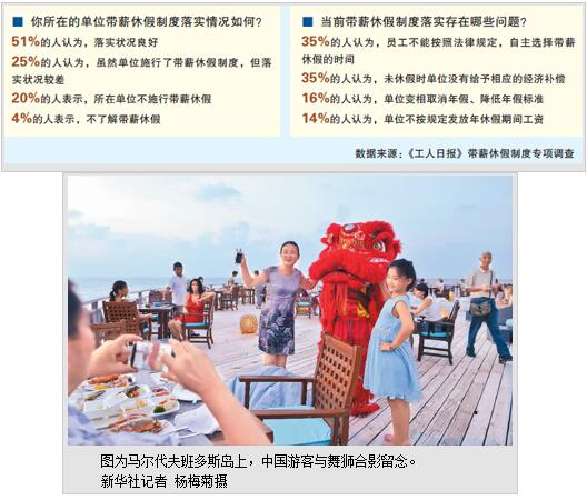 目前,已有包括河北、江西、重庆等10多个省区市出台细则,把落实带薪休假纳入议事日程。湖北省要求劳动监察部门加强执法检查;河北明确,将带薪休假的落实情况,作为机关事业单位以及企业的重要考核指标;浙江则提出,鼓励企业将职工旅游休闲作为福利措施,发放旅游消费券、休闲补贴等。