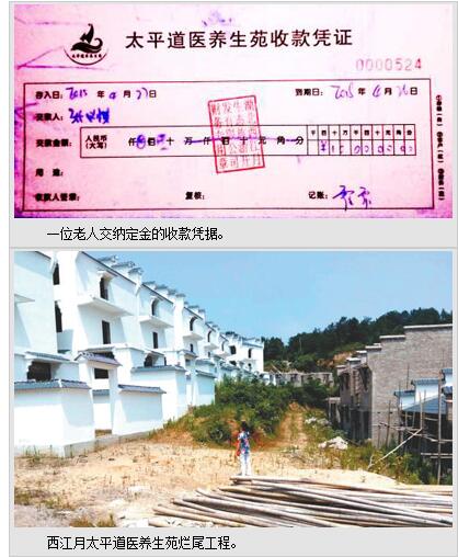 2014年,湖北省红安县太平桥镇通过招商引资在毛岗岭村兴建了“西江月太平道医养生苑”,开发商为湖北西江月生态旅游开发有限公司。第一期工程建成40栋徽式养老公寓,2015年4月举行了隆重的封顶工程庆典。不料,之后开发商资金链断了,该项目成了烂尾工程。截至目前,已有1000多位老人预定了床位,他们交纳定金3万、5万甚至十几万元不等,总金额达5000万元左右。数额巨大的定金至今未能拿回。