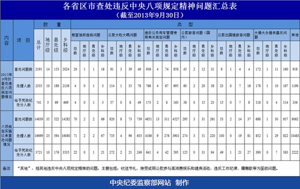 人民网北京11月18日电 据中央纪委监察部网站消息,为及时掌握各地区贯彻落实中央八项规定精神情况,中央纪委建立了月报制度。截至今年9月30日,各省区市共处理违反中央八项规定精神问题16699人。汇总情况如下: