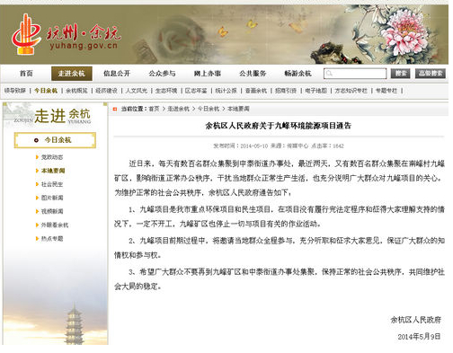 据浙江杭州余杭区政府网站10日消息,余杭区人民政府日前发布关于九峰环境能源项目通告。通告称,近日来,每天有数百名群众集聚到中泰街道办事处,最近两天,又有数百名群众集聚在南峰村九峰矿区,影响街道正常办公秩序,干扰当地群众正常生产生活,也充分说明广大群众对九峰项目的关心。为维护正常的社会公共秩序,余杭区人民政府通告如下: