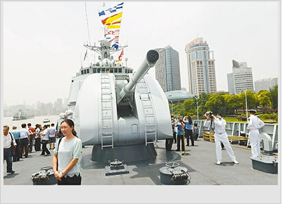 结束军演后,中方指挥舰郑州舰和俄方指挥舰“瓦良格”号导弹巡洋舰亮相上海国际客运中心码头,向市民开放参观。图为游客们在郑州舰上参观。