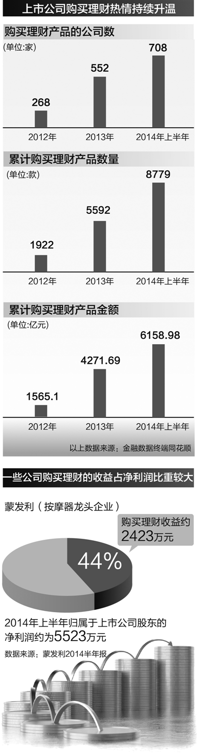 同花顺数据显示,2012年,上市公司中有268家累计购买理财产品1922款,合计金额1565.1亿元;2013年,有552家上市公司累计购买5592款产品,合计金额4271.69亿元;而仅仅2014年上半年,已有708家上市公司累计购买8779款产品,合计金额达6158.98亿元。可见,上市公司理财的热情在持续升温。