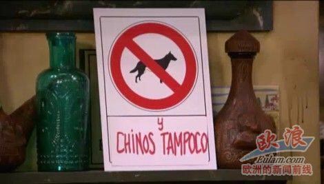 中新网5月20日电 据西班牙欧浪网报道,日前,西班牙电视五台再度播出辱华节目,在这家电视台的一档轻喜剧中,公然出现了辱华类的语言以及“华人与狗不得入内”的招牌。