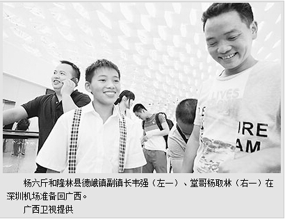 临近学校的期末考试,为了让杨六斤顺利完成春季学期的学业,6月20日,德峨镇副镇长韦强、德峨镇新街小学校长杨继勇、堂哥杨取林以及广西电视台两名记者,携带公函前往深圳康桥书院去接杨六斤。据杨继勇介绍,在康桥书院杨六斤见到亲人后非常高兴,杨继勇问杨六斤是否愿意和他们回隆林,杨六斤回答愿意。