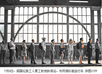 当地时间2015年7月9日,由于就伦敦地铁和第一大西部铁路新增服务线路的薪资谈判破裂,英国伦敦地铁工人举行大罢工,导致大范围的交通中断,数百万市民只能改用乘公交、骑自行车和步行等方式出行。