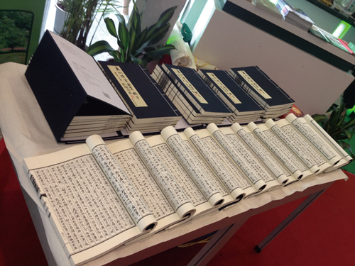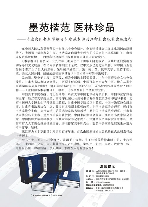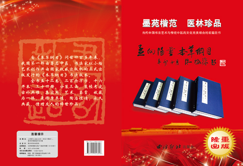 2011年,我就《本草纲目》书法手卷的出版事宜专程去北京向国家中医药管理局有关领导进行汇报,艺术界权威出版机构西泠印社出版社慧眼识真,当即决定,共同出版书法版《本草纲目》这一具有现实意义和历史意义的鸿篇巨作。《本草纲目》书法精装收藏版本,采用传统工艺装帧,每套34册,分装三函,国内外公开、限量发行。目前,首版200套已被全国二十多所中医药大学图书馆医史馆、国际友人及部分收藏界人士收藏。