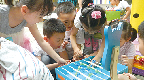 小朋友们一边欣赏,一边游玩,还一边打分。他们要评选出自己最喜爱的玩具。原来,这是星星幼儿园本学期的一项教学实践项目。这个活动还有一个好听的名字:巧手老师,我爱你!