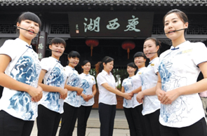 为迎接运博会,瘦西湖景区组织导游团队进行业务提升培训,请来礼仪老师对导游进行文明礼仪、微笑服务等系列培训,以最佳的精神面貌迎接八方来客。图为导游们进行咬筷子训练,力争将自己最美的一面呈献给世界各地嘉宾。