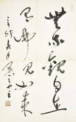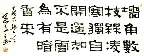 取法乎上,意境高远"我习隶书和行草书,得益于魏之桢,孙龙父先生……,魏先生诗文书印俱佳,才思敏捷,目光如炬,评点作品,开门见山,或褒或贬,直截了当。孙先生擅长金石书画,为人简穆,看别人作品(包括晚辈的)总以鼓励为主,偶而也会提醒在某处要稍加留心,然后不置一辞。丁素清先生说:"几十年过去了,如今忆及当年魏先生,孙先生评点书法的言语,虽有轻有重,其实和禅宗的'棒喝'如出一辙,重者,让你醍醐灌顶般地清醒,轻者,让你在时光流逝中慢慢体悟。"丁素清先生隶书宗汉碑,《张迁》、《华山》、《礼器》、《石门》,均痛下过功夫;行草书宗二王和怀素,熟读《十七帖》、《书谱》、《食鱼帖》、《自叙帖》。其隶书六尺中堂意临《华山碑》写来不疾不徐,端庄厚重,古意盎然;行书《鹅池》仅两平尺,写来神闲气定,淋漓酣畅;三尺整张草书中堂《无我观自在,有佛现如来》,笔法跳越,神采飞扬。四尺甲骨联《观廿四史考历代,学十三行知八分》,行笔干净利落,书卷气十足;六尺对开1×4简书《爱莲说》通景万毫齐力,沉着痛快。读之,可以想见丁素清先生心手双畅之意态。