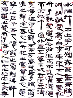 取法乎古,溯源求本上世纪70年代初期,篆刻家邵长光先生力荐,丁素清结识了书坛名宿张华父、魏之桢、孙龙父先生。由于他们的引领,他明白了写字与书法的差异,明白了学书过程是一个顿、渐合参的漫长过程。自此他的书法创作进入了新的天地。张华父先生为邗上小学名家,有《文字学概述》、《小学百问》等著述传世。"其时,张华老已年逾古稀,精神矍铄,讲说文,讲形意义,示范小篆偏旁部首写法,毫无倦意。张华老嘱他找一本许慎的《说文解字》,反复阅读,反复摹写"。自此,丁素清先生由两汉到秦,由西周到殷商,凡甲骨,金文,籀文小篆,皆悉心临写。90年代中期,西冷印社出版了一套金文鼎铭影印本,他购得后如获至宝,对其中的《散氏盘》、《大盂鼎》更是珍爱有加。"苍天不负有心人",执着的追求,超常的勤奋给他带来了丰厚的回报。四尺对开小篆《秦时明月汉时关》结体端秀,婉通自然;六尺对开1×4通景《散氏盘》临本,古拙朴茂,气象巍峨;金文《书以载道》端庄凝重,力透纸背,其四行短跋,更是言简意赅,发人深省。