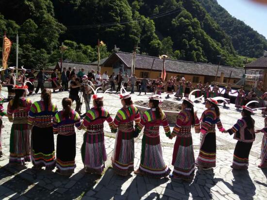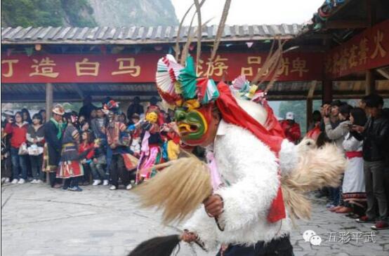 无时不歌、无处不舞,会说话便会唱歌、会走路就能跳舞,是白马人的真实写照。白马人世代孕育的思想感情和多姿多彩的社会生活,全部体现在歌舞之中。不论是娱乐劳作,敬神祈福,婚丧嫁娶,迎宾送客,谈情说爱,都是以歌舞相伴。 白马人歌声浑厚豪迈,犹如巨浪起伏,舞姿舒展洒脱,豪放稳健,尤如雄鹰展翅。篝火晚会更是白马人在夜晚抒发感情、联络友情、寻求爱情的场所,他们一边喝着蜂蜜酒、一边吃着烤全羊,一边手牵着手,映着红红彤彤的篝火,合着欢快的《圆圆舞曲》的节拍,跳起欢快的舞蹈。篝火映红山峪,歌声响彻云霄,宾主欢歌笑语,通宵达旦,其乐融融。