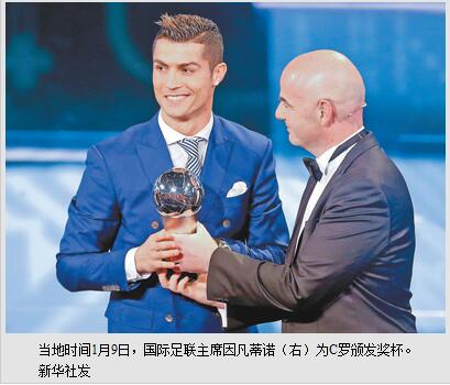 据新华社苏黎世1月9日电 (记者张淼)当地时间9日在苏黎世举行的颁奖仪式上,葡萄牙球员C·罗纳尔多(C罗)力压竞争对手梅西和格列兹曼,荣膺国际足联2016年世界足球先生称号。