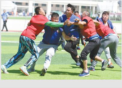 7月13日,在内蒙古自治区第九届少数民族传统体育运动会男子九人制抢枢循环赛中,通辽市代表队队员与乌海市代表队队员进行拼抢。