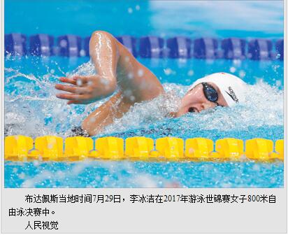 布达佩斯当地时间7月29日晚,中国小将李冰洁在2017年游泳世锦赛女子800米自由泳决赛中,以8分15秒46这个打破亚洲纪录的成绩获得银牌。这个项目的冠军获得者是美国名将莱德基。