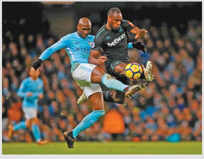 当地时间12月3日,曼彻斯特城队球员曼加拉(左)在比赛中与西汉姆联队球员安东尼奥拼抢。
