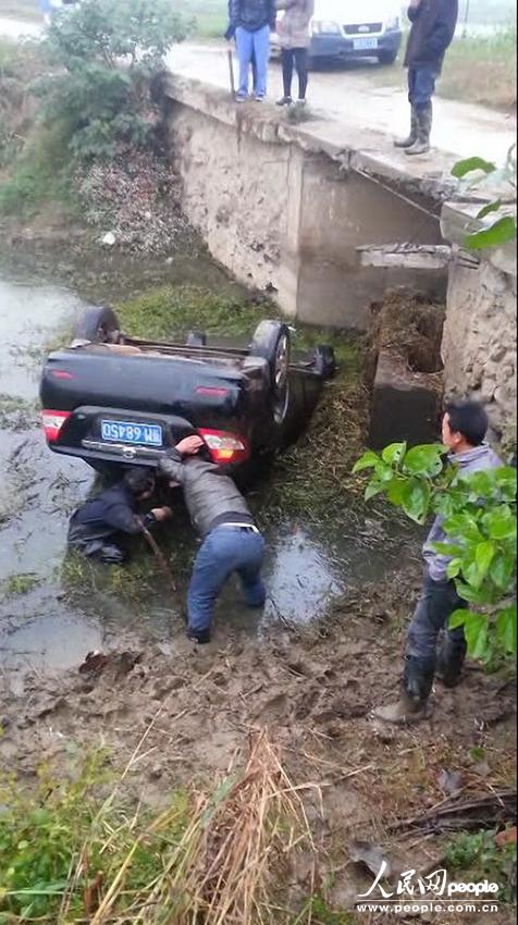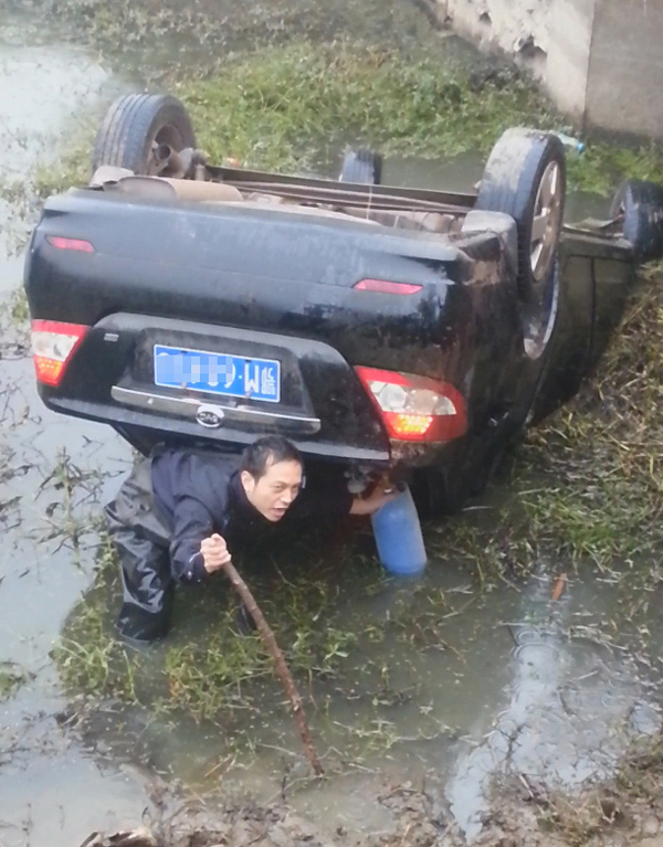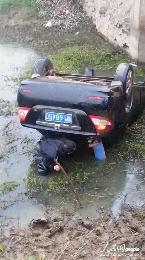 11日16时许,仙桃人何某驾驶一辆灰色比亚迪小轿车从该市西流河镇返回城区,途经西流河镇许中村一座石板桥时,因天雨路滑,小车失控冲到桥下,倒扣在河水里。一名过路的群众发现后报警。西流河派出所民警张立卫等人赶到现场后,透过车窗发现,司机倒挂在驾驶室里,脚卡在座椅与方向盘、刹车板之间,无法动弹。由于车门紧锁,又担心河水灌入车内,救援人员只能砸开露在河水外面的后挡风玻璃,一边询问何某的情况,一边寻找吊车救援。此时河水还在不断向车内渗入,而困在车内的何某告诉民警,自己闷得慌。张立卫拿着120急救车上的一个氧气瓶就下了水。这几天正逢降温,阴雨绵绵,河水刺骨。热心的村民为张立卫拿来了一件下水衣,还给被困司机送来棉衣。张立卫将氧气吸管塞到何某口中后,却发现由于吸管较短,氧气瓶无法安放,只能托举在手中。而此时,被困近半个小时的何某情绪已极不稳定。张立卫站在水中,弯着腰,一边举着氧气瓶,一边不断安慰他。这一站就是半个多小时。