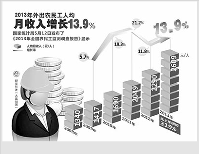 国家统计局的分析认为,近年农民工工资水平快速提高,既是国民经济持续快速增长的结果,也是农民工工资水平长期偏低这一不正常现象的合理回归。农民工工资水平持续快速提高是多方面因素的综合作用,一是最低工资水平标准不断提高,2013年有27个省(区、市)相继提高了最低工资标准;另一方面,也是我国劳动力市场供求关系正在发生深刻变化、城市生活成本迅速上升等现实情况的客观反映。