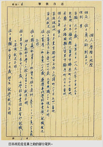 中央档案馆7月6日公布了日本战犯佐佐真之助的侵华罪行自供提要。