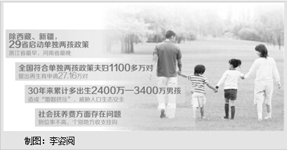 “改革开放以来,我国出生人口性别比一直偏高,尽管2009年开始出现拐点,近5年呈持续下降趋势,但是降幅有限,2013年仍达117.6,偏离正常值10多个点。”南开大学教授原新说,持续30余年的出生性别比偏高,我国已累计多出生了2400万—3400万男孩,不仅造成“婚姻挤压”,更威胁人口生态安全。