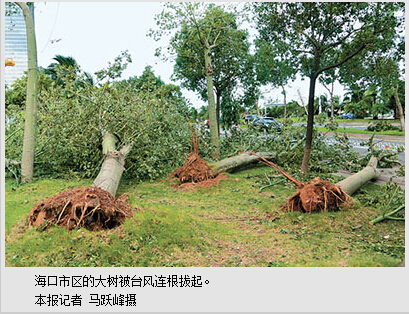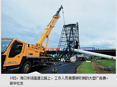19日上午,记者在海口市白龙路、滨江路、国兴大道等处看到,隔离护栏、大型广告牌被飓风吹倒。大树或被连根拔起,或被拦腰斩断。市区停水、停电。十字路口的红绿灯无法显示造成交通拥堵。