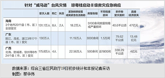 19日,广东省民政厅向湛江调拨1000顶帐篷、2000张折叠床、2000床毛巾被、1000床棉被、2000套衣服。广西壮族自治区党委派出8个工作组到8个地级市检查指导防灾救灾工作,取消干部休假。海南省民政厅19日上午向文昌市调拨100顶帐篷、300床棉被、300件运动服、200双草鞋、50箱蜡烛,与生产厂商协议采购的饼干等生活物资已运往受灾严重的文昌市和海口市美兰区三江镇。海南省领导要求,先期向海口、文昌各下拨3000万元救灾资金,向定安、澄迈各下拨2000万元救灾资金。