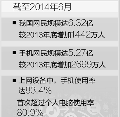 报告显示,截至今年6月,我国网民规模达6.32亿,较2013年底增加1442万人。互联网普及率为46.9%,较2013年底提升了1.1个百分点。手机网民规模达5.27亿,较2013年底增加2699万人。手机上网的网民比例为83.4%,相比2013年底上升了2.4个百分点。台式电脑和笔记本电脑上网网民比例略有下降,分别为69.6%和43.7%。手机上网比例首次超越传统个人电脑上网比例(80.9%)。同时网民在手机电子商务类、休闲娱乐类、信息获取类、交流沟通流类等应用的使用率都在快速增长,带动整体互联网各类应用发展,推动网民生活的进一步“互联网化”。