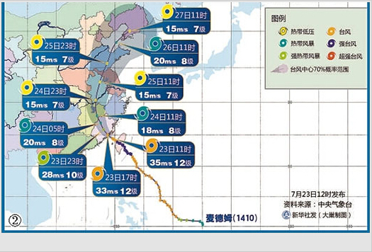 本报北京7月23日电 今年第10号台风“麦德姆”在横穿台湾岛之后,已于23日15时30分在福建福清南部高山镇沿海登陆,登陆时强度已由之前的台风级减弱为强热带风暴,中心附近最大风力有11级(30米/秒),中心最低气压为980百帕。根据中央气象台的“麦德姆”路径概率预报图,此次台风在登陆福建后,将顺势北上,经由江西、安徽、浙江、山东等东部省份,最后抵达辽东半岛(见图②)。目前,福建江西两地正在积极开展各项防御准备工作。同时,受超强台风“威马逊”影响的地区也在八方支援之下,妥善安置受灾群众、抓紧恢复基础设施。