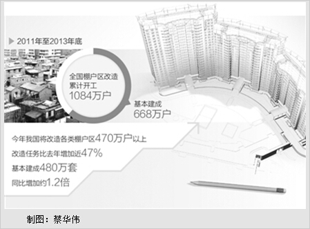 2011年至2013年底,全国棚户区改造累计开工1084万户,基本建成668万户。今年我国还将改造各类棚户区470万户以上,改造任务比去年增加近47%;基本建成480万套,同比增加约1.2倍。“在各类棚户区的居民中,中低收入家庭比例高,下岗失业和退休职工、外来务工人员相对集中,实施棚户区改造,有利于加快解决上述家庭的住房困难。通过户均45平方米以上的‘保底’安置,明显改善了居民的住房条件与环境质量,实现了‘住有所居’的住房政策目标。”刘洪玉说。