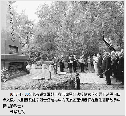 前人用鲜血铸就的和平需要后人加倍珍惜和维护。中国驻俄罗斯大使李辉在致辞中表示,中国人民抗日战争是世界反法西斯战争的重要组成部分,这其中得到了苏联人民的大力支持和援助,中国人民不会忘记他们所作出的贡献。明年是中国人民抗日战争暨世界反法西斯战争胜利70周年,中俄将根据两国领导人达成的共识,共同举办好一系列隆重纪念活动。