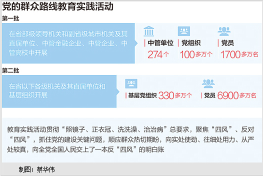 按照党中央部署,党的群众路线教育实践活动从2013年6月开始,自上而下、上下结合,分两批有序进行,到2014年9月底基本结束。第一批活动在省部级领导机关和副省级城市机关及其直属单位、中管金融企业、中管企业、中管高等学校开展,共有274个中管单位和100多万个党组织、1700多万名党员参加;第二批活动在省以下各级机关及其直属单位和基层组织开展,共有330多万个基层党组织、6900多万名党员参加。