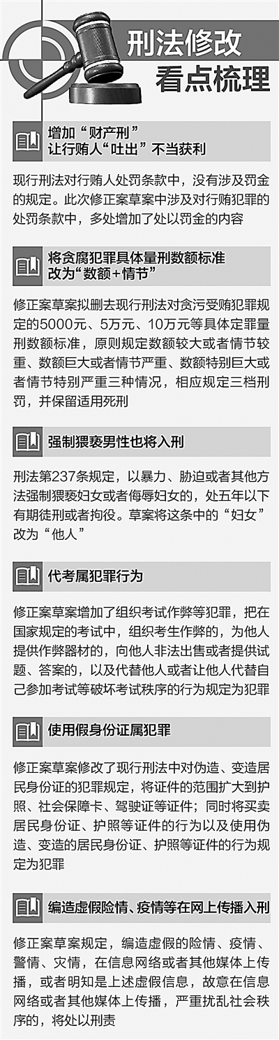 逐步减少适用死刑罪名,是落实党的十八届三中全会关于逐步减少适用死刑罪名和2014年开始的中央深化司法体制改革内容的一项修改。一方面,草案减少了9个死刑罪名,其中包括5个经济犯罪,即走私武器弹药罪、走私核材料罪、走私假币罪、伪造货币罪、集资诈骗罪;两个社会管理秩序方面的犯罪,即组织卖淫罪、强迫卖淫罪;两个军人违反职责罪,即阻碍执行军事职务罪、战时造谣惑众罪。