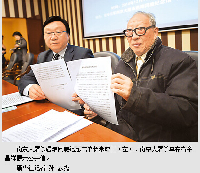 “南京大屠杀死难者遗属致联合国人权机构公开信”由3361名南京大屠杀遇难者遗属和幸存者联合起草。遇难者遗属在公开信中表示:“我们深知铭记历史不是为了延续仇恨,只有在尊重历史事实的基础上,中日两国人民才能达到真正的和解。为此,我们强烈呼吁贵组织,以你们的国际影响力,站在维护人权、公平和正义的立场上,敦促日本政府履行人权义务,对侵略和加害的历史进行诚挚反省。”
