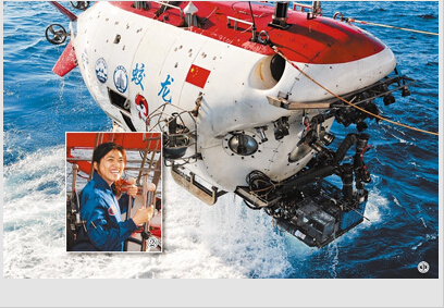 图②:中国首名女潜航员学员张奕搭乘“蛟龙”号下潜,接受实践操作培训。