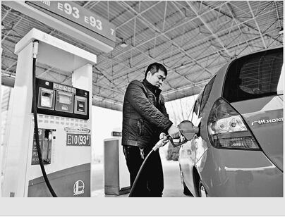 1月26日,车主在河北保定一家加油站为机动车加油。当日,国家发改委发出通知,决定将汽、柴油价格每吨分别降低365元和350元,测算到零售价格90号汽油和0号柴油(全国平均)每升分别降低0.27元和0.30元,调价执行时间为1月26日24时。这是国内成品油价格首次实现“十三连跌”。