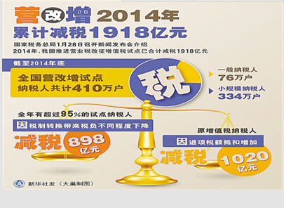 税务总局表示,税务部门将继续推进营改增扩围,今年力争将营改增范围扩大到建筑业和不动产、金融保险业、生活服务业,这些行业将增加800万户试点纳税人,户数是目前的两倍,减税规模也将大幅增加。