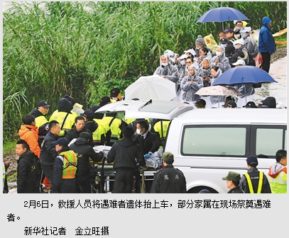 与此同时,搜救工作仍在持续进行。除了调派直升机、船舰自空中和水面搜寻外,因为基隆河水位降低,搜救人员也不顾寒冷,手拉手站在飞机坠落地点,进行细密的地毯式搜寻。上午10时许,部分遇难大陆旅客的家属来到事故现场凭吊,为亲人招魂。自家属到达河边后,搜寻队先后发现4具遗体,其中一对是十余岁的小兄弟,应是大陆乘客名单中一直寻找的两个孩童。