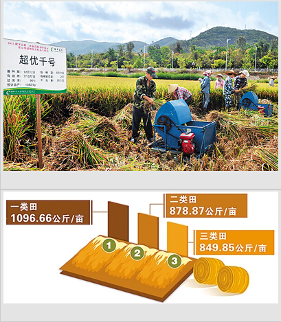 近日,水稻专家在海南三亚示范基地对袁隆平指导的第五期超级杂交稻“超优千号”进行了测产验收。测产验收的结果是平均亩产达941.79公斤,打破了海南水稻亩产最高纪录。