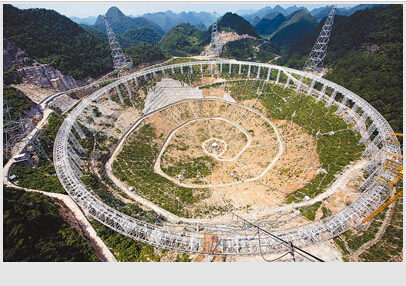 正在贵州黔南安装建设的500米口径球面射电望远镜,是目前世界上在建的口径最大、最具威力的单天线射电望远镜,建成后将成为世界级射电天文研究中心。目前已经完成索网制造及安装工程、支撑框架建设,即将进行反射面面板拼装。图为7月27日,正在建设的射电望远镜。