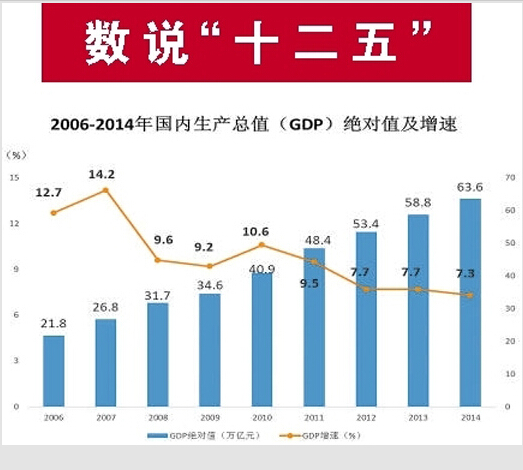 经济增速放缓,但经济结构深刻变化,质量效益稳步提高,发展的“含金量”更高。“十二五”期间,消费对我国经济增长的贡献率达到了60%,服务业对增长的贡献率首次超过第二产业,高技术产业增速明显快于整体工业,新产业、新业态、新产品、新模式等新兴的增长动力加速孕育,增长可持续性更强。2014年,我国国家全员劳动生产率比2010年提高逾34%,研究与试验经费支出比2010年提高了88%,科技经费投入规模已位居世界第二,科技人员规模位居世界第一。