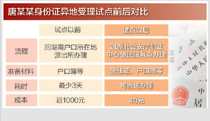 “目前,在武汉市、襄阳市、黄冈和黄石城区已经实现了身份证异地受理。截至11月20日,全省受理制作异地身份证13万余人次。”湖北省户政基础支队工作人员介绍,2016年上半年,湖北省将在全省各地设立异地办证受理点,并全面实现市、州内异地办证。届时,户籍地在湖南省、现居住地在湖北省的居民需要换领、补领身份证,可在省内就近异地办理。