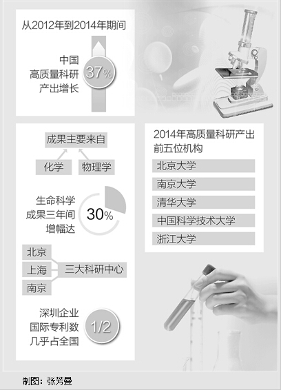 中国在自然指数中的科研成果主要来自化学和物理学,分别占中国WFC总分值的61%和30%。值得注意的是,生命科学方面的科研成果快速增长,3年间增幅达到30%。统计还显示,北京、上海和南京是中国的三大科研中心,而深圳、北京和武汉是中国三大科研成果产业化基地,因为这些城市有许多具有重要科研贡献的公司,尤其是在高端生命科学领域。其中,深圳已发展为基于科研的产业中心,深圳企业拥有的国际专利数量,几乎占全国国际专利总量的1/2。