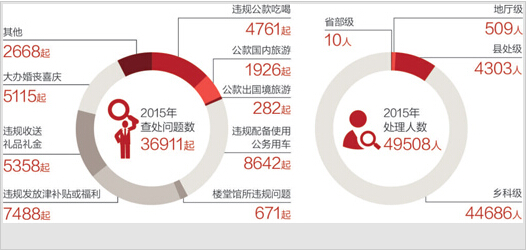 从2015年查处的问题类型看,违规配备使用公务用车最突出,达到8642起;其次是违规发放津补贴或福利(7488起)、违规收送礼品礼金(5358起)、大办婚丧喜庆(5115起)、违规公款吃喝(4761起)等。从涉及的人员看,2015年有10名省部级干部受到处理,8人被给予党纪政纪处分;有509名地厅级干部、4303名县处级干部、44686名乡科级干部受到处理。
