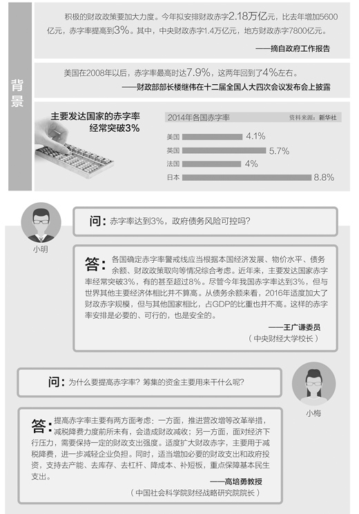 根据预算报告,2016年我国财政赤字拟安排2.18万亿元,比2015年增加5600亿元,赤字率为3%,比2015年提高0.6个百分点,是改革开放以来最高的一年。