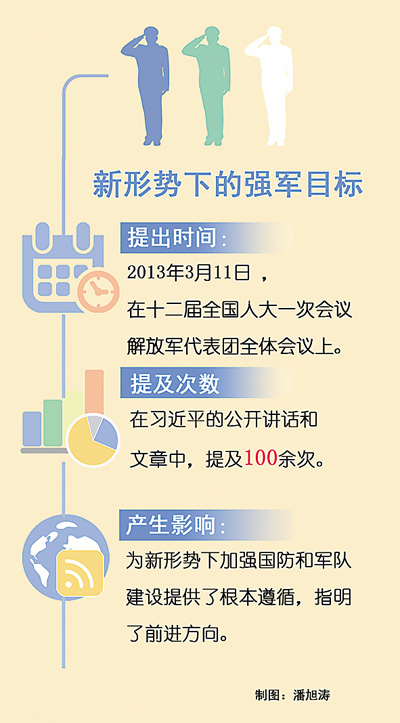 3年前,习近平在十二届全国人大一次会议解放军代表团全体会议上提出:建设一支听党指挥、能打胜仗、作风优良的人民军队,是党在新形势下的强军目标。据不完全统计,3年来,在习近平公开讲话和文章当中,提及强军目标100多次。党在新形势下的强军目标为加强国防和军队建设提供了根本遵循。