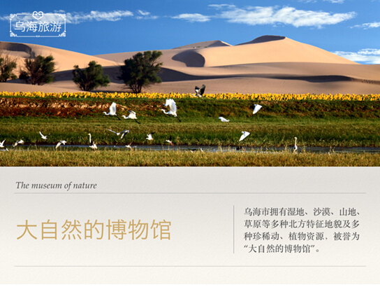 乌海物华天宝,人杰地灵,是一座古老而又年轻的城市,这里河湖纵横、山川耸立、沙漠连绵、草原辽阔,是集塞外豪放与水乡婉约于一身的户外运动首选之地。在1754平方公里的区域面积内汇集了河流、湿地、高山、草原和沙漠等地容地貌。乌海的国家级保护植物四合木被学术界誉为“活化石”,石炭纪硅化木被称为亚洲之最,距今5000年的桌子山岩画群被列入国家级重点文物保护单位。人文景观有成吉思汗雕像、古汉城遗址、古汉墓、满巴拉僧庙、明代长城烽火台等。乌海素有“黄河明珠”、“乌金之海”、“沙漠绿洲”、“葡萄之乡”、“书法之城”、“赏石之城”之美誉,它完美的诠释了乌海的地理和人文环境。随着国家重点工程黄河海勃湾水利枢纽工程的建成,一个118平方公里的“乌海湖”正在形成,已构成依山傍水、沙水相连、特色鲜明的独特风景,形成城在水中,河在城中景观,使乌海真正成为黄河金腰带上的明珠;乌海在北纬39度线上,水土光热资源丰富,适合葡萄种植,现有120多个品种,多个葡萄品种、葡萄酒荣获国际、国家级奖项,“乌海葡萄”地理商标已成功注册;随着高88.95米的甘德尔山成吉思汗雕像的即将建成,届时将打破多项吉尼斯纪录;乌海是“中国书法城”、“中国硬笔书法名城”、“中国赏石之城”,建成了国内单体面积7.6万平方米最大的当代中国书法艺术馆,成功举办了七届国际书法产业博览会。乌兰布和沙漠、库布其沙漠和毛乌素沙地交汇在这里,近年来乌海下大力气构建绿洲型山水园林宜居环境,被评为全国绿化模范城市和国家园林城市。