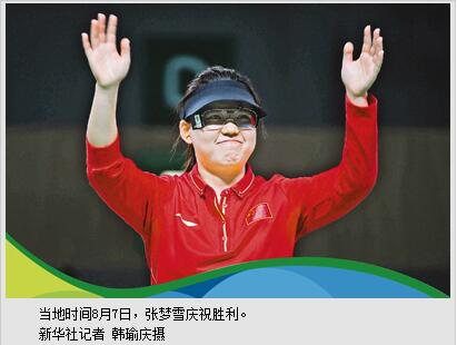 当时没人想到,张梦雪准起来就一发不可收拾,更没人想到,她能在如此关键的一枪中打出10.9环。“我平常在训练里也打出来过10.9环,只要做好自己就能出现。”张梦雪说。“做好自己”,是她赛后说得最多的一句话。“初生牛犊不怕虎,就像昨天气步枪夺冠的美国小姑娘一样。”王义夫点评道,张梦雪算得上是一名比赛型选手,2015年,首次代表中国队出战射击世界杯韩国站的她便勇夺银牌,为中国队拿到了一个宝贵的奥运会参赛名额。