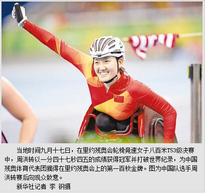 田径队当日有7金入账。在轮椅竞速女子800米T53级决赛中,周洪转破世界纪录夺冠,这是中国代表团在里约残奥会上拿到的第100枚金牌。此外,在女子1500米T11级决赛中,郑金刷新自己保持的世界纪录夺冠。吴国山夺得男子铅球F57级冠军,周霞在女子200米T35级比赛中夺冠,董飞霞和米娜分别在女子铁饼F55级、F37/38级比赛中摘取金牌。崔彦峰、刘洋、李虎召、刘成明组成的接力队拿下男子4×400米接力T53/54级比赛冠军。